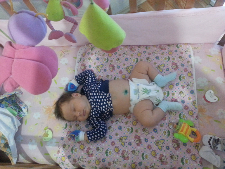 Но на дневной удается уложить в кроватку, засыпает сама под мобильку: