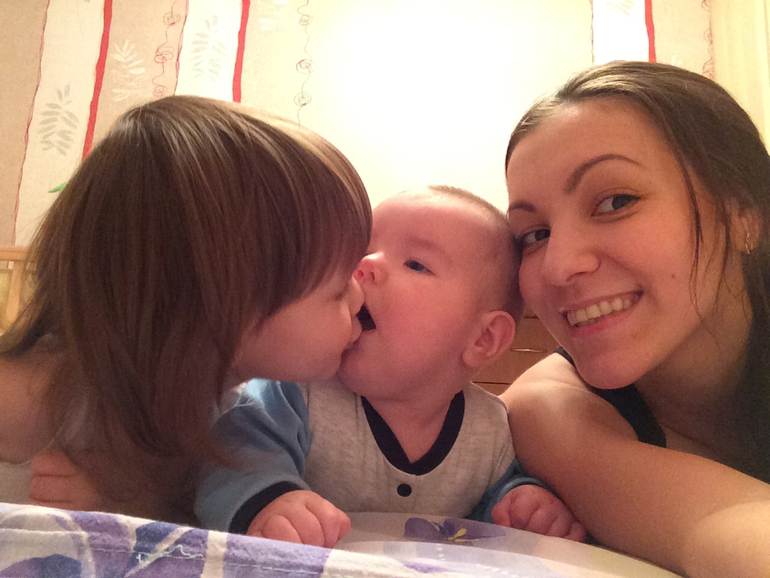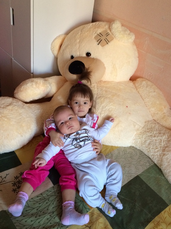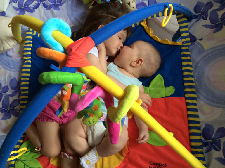 С Аишей ладят, играют, Ришатик очень любит ее внимание) с ней всегда улыбается) она ему песенки поет, разговаривает с ним, успокаивает, погремухами машет, ругает,когда пальчики в рот берет, в шезлонге качает)