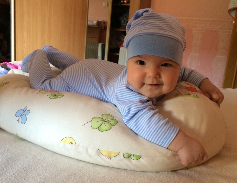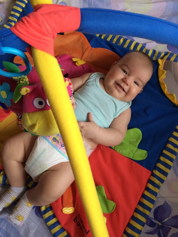 Влёгкую переворачиваемся на живот и обратно, бывает по два раза кувыркается подряд) интересуется всем, по дому ходим, все рассматривает, рвется туда, где что-то приглядел, аж вырывается...лежит теперь уже редко. Лежа на животе пытается ползти, при этом поднимает попу, а с позавчера начал делать упор лежа))т.е.пузень и ноги поднимаются, упирается стопами и головой в этот момент в "пол"))(поверхность, где лежит точнее) и вопит, как штангист, когда поднимает штангу с большим грузом))) крутимся вокруг своей оси.