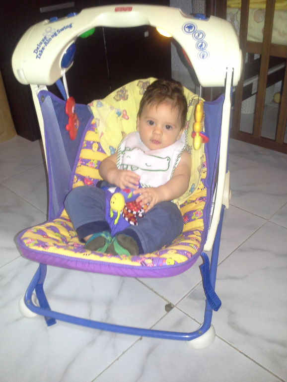 Зато сидит в стуле и в качельках замечательно