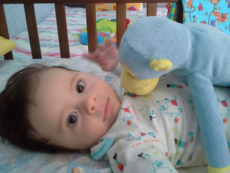 Теперь могу оставить его одного играть в игрушки и он их почти не теряет из рук. Играть спокойно он не умеет. Обязательно надо крутить во все стороны и вертеть, перекладывать из руки в руку, и пока он не умел, приходилось сидеть возле него и подстраховывать. Ато был скандал!
