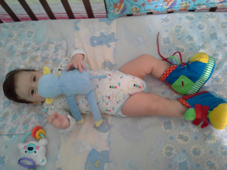 Во всю играет в игрушки. И может даже подобрать игрушку которая лежит с боку лежа на спине. Переворачивается только на бока, на живот ни ни....Я не паникую в запасе есть еще месяц (где то вычитала, что к 6 месяцам должен крутиться на все 180 в обе стороны) тем более что мы тяжеловесики. Трудно ему наверное.