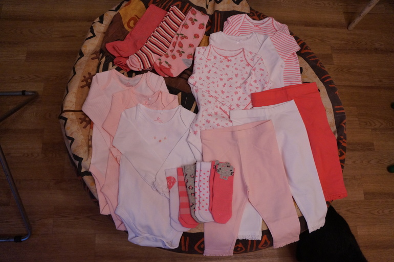 Качество как всегда на высоте. Отдельно хочу написать про размеры. Мы пока еще носим 62 (1-3 мес.), но многие мамы пишут, что детки с близкими к нашим параметрами, носят уже Next 62-68 (3-6 мес.). Поэтому я решила бодики заказать и 3-6 мес. (верхние на фото) и 6-9 мес. (нижние). Так вот они абсолютно одинакового размера! Притом 6-9 даже более узкие)) Все остальное размера 6-9 мес. Колготки и леггинсы из одежды для девочек от 3мес. до 6 лет, т.к. для малышей почти ничего не было нужного размера.