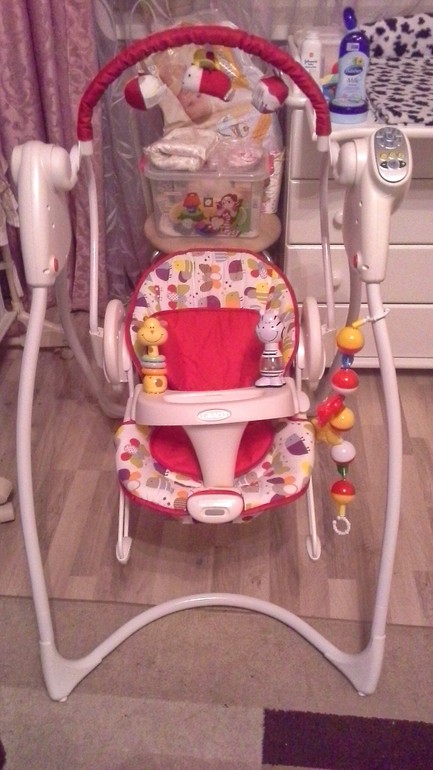 ХвастаемсяПосле долгих и мучительных выборов..все-таки решилась на покупку качелей Graco swing n bounce 2 в1 ))До этого был куплен шезлонг-качалка Brevi, который меня расстроил((Позже выложу фото с описанием)Доченька уже протестировала качель)минут 15 мы просидели, слушая музыку и болтая с игрушками над головой)))Деть счастлив, а значит счастлива мама)хотя поначалу она была повергнута в шок))) теперь шезлонг пойдет на продажу, скорее всего, ведь он есть в качелях) обязательно выложу тест-драйв с подобностями)для тех, кто мучает себя выбором) Радует также, что есть игрухи на столике, отдельное спамибо "Детскому миру",в интернет-магазах поставка без игрушек, увы( А пока хвалюсь покупкой)