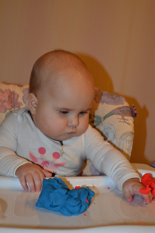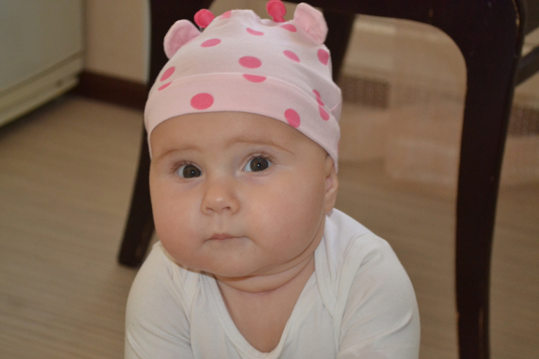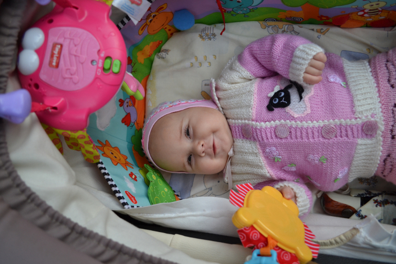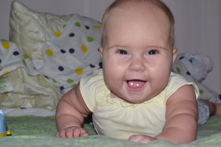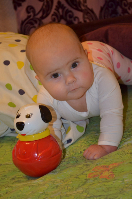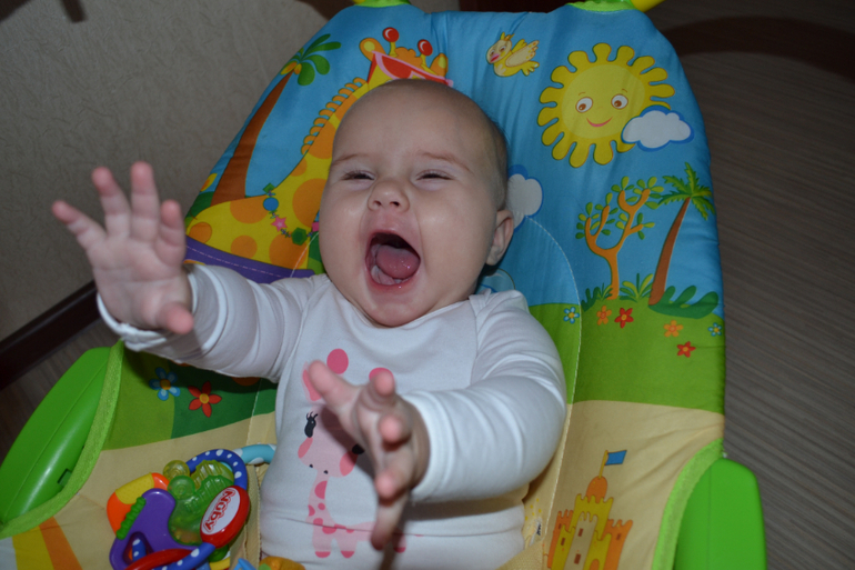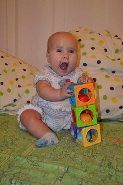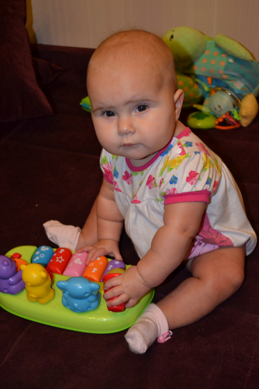 Перейдем к умелкам. За этот месяц произошел огромный скачок в Настином развитии - мир из преимущественно горизонтального вдруг стал вертикальным - Настя села! Первый раз это произошло в 5 мес и 1 нед, потом постепенно стала садиться чаще и мы стали ее сажать. Заваливалась она как-то совсем немного, очень быстро стала сидеть уверенно, сейчас вообще не падает.