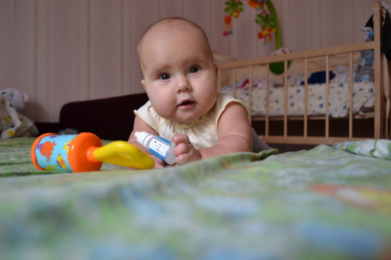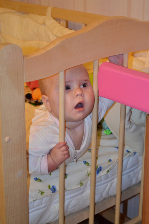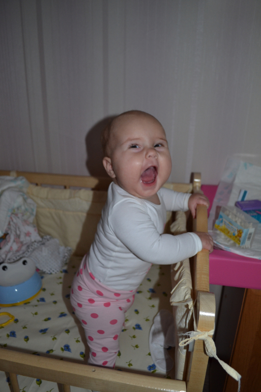А еще теперь эту егозу ничто не может удержать на месте, потому что Настя поползла! Первый раз это случилось в 5 мес и 2-3 недели, сейчас ползает очень быстро и уверенно. Ползать задом Настя умела уже давно, попытки ползти вперед почти не предпринимала, только вставала на руки и на колени и делала рывок вперед с вытянутой рукой. А потом как-то резко просекла, что если ползать вперед, то можно добиваться гораздо большего и резко научилась!
