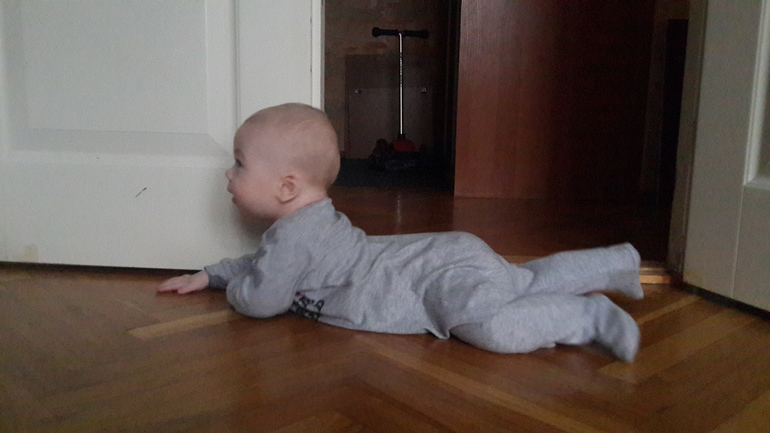 Из умелок, ползает сам довольно активно и быстро, моторика превосходит Верину в ее возрасте, зубы не прорезались.