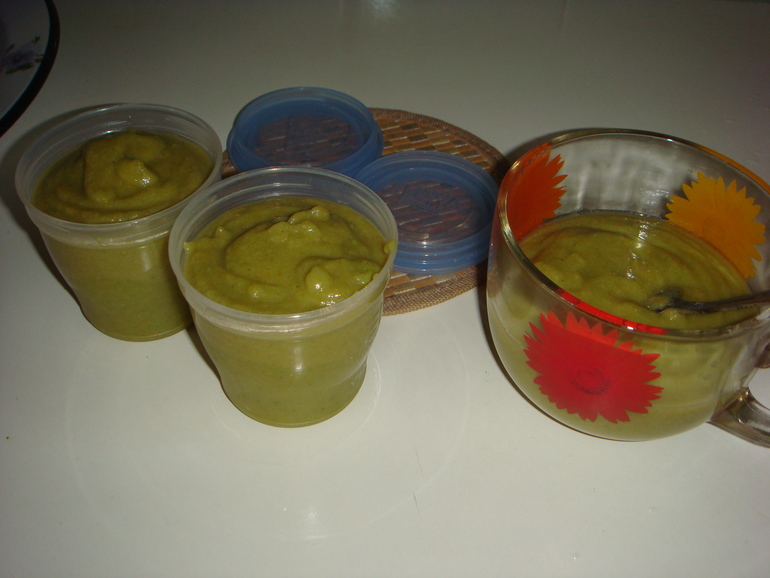 Блендерим и раскладываем по контейнерам(заранее обданным кипятком с крышками),а то что осталось на обед кушаем+подсолнечное масло)
