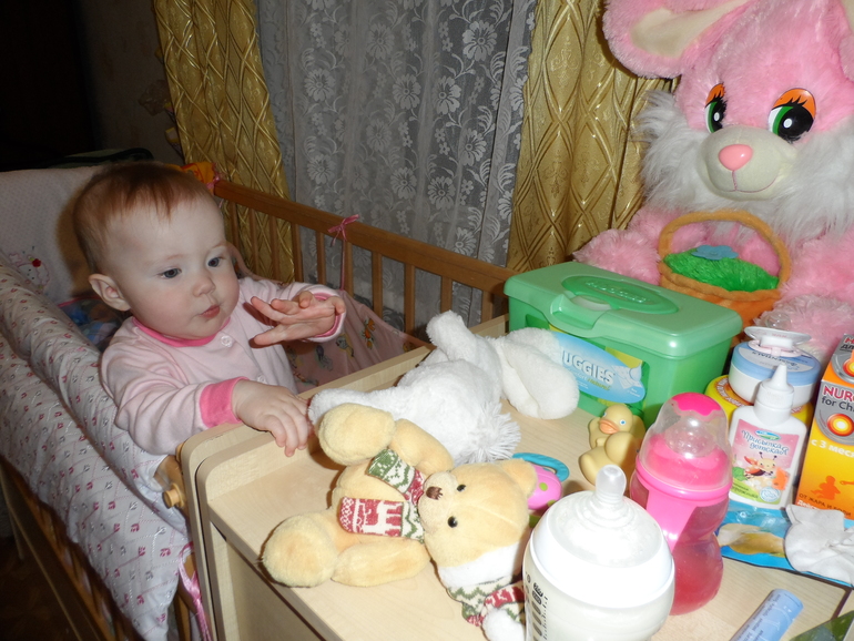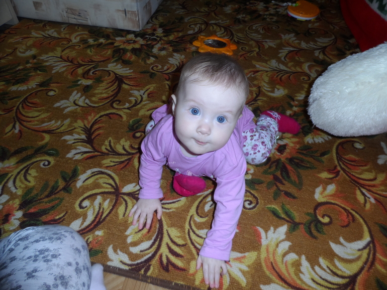 Ползает, как маленький вездеход. Она повсюду: в шкафу, под столом, за обувной полкой...только что пыталась облизать пылесос, вот уже рвёт и жует какие-то бумажки, через минуту- выбрасывает свою одежду из комода, лезет в тарелку с едой или к цветам...обожает отрывать трубочку от помпы (стоит на бутыли с водой) и дудеть в неё