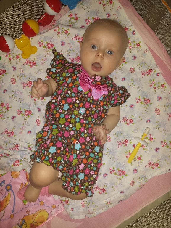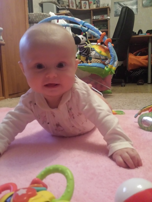 На самом деле как то странно идет время. То кажется что оно пролетело,а иногда кажется что целая вечность. Что дочка была всегда. Развиваемся середнечком,никуда не спешим и не отстаем. Переворачиваемся со спины на живот и обратно,но пока только через левый бок,через правый похоже ленится т.к. на правый бок легко ложится. Играет с игрушками,перекладывает из одной руки в другую и естественно в рот. А во рту набухшие десна,которые нужно чесать,а чесать больновато и можем похныкать и поплакать. Крутится на животе вокруг своей оси очень лихо,пытается ползти (очень смешно),поднимает попу и как гусеница пашет носом. Ничего не получается и жутко возмущается! Может поиграть сама минут 10-15 в манеже,потом на полу,потом шезлонг и в итоге на руки. Нужно меня видеть или хотя бы слышать. Поэтому когда хожу в душ ставлю шезлонг около ванной и она сидит спокойно минут 15. Учимся целоваться,хорошо получается по французски и за нос или за щеку,чудно,обнимается со мной.С вводом прикорма наладился стул!!!это вообще для меня радость. У нас ГВ,теперь еще кушаем цв.капусту,кабачок,яблоко,грушу. Вот хочу еще кашу вводить,уже купила,завтра будем пробовать. В идеале хочу потом на ночь давать,чтобы ночью лучше спала. По прежнему не жалуем воду,иногда может немного чай попить. Купаемся теперь на руках или на дне ванной с душем. А среду идем в бассейн в поликлинику,а в среду к неврологу,чтобы прописали массаж. Еще не делали ни одного курса. Ночью спит терпимо,график у нас более или менее имеется,живем вроде дружно. Доча радует каждый день своей беззубой улыбкой,своим смехом,счастливым визгом и писком. Бывает и ноем,плачем,но всё это мелочи!!! Всем добра,любви и хорошего настроения!