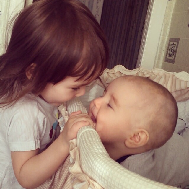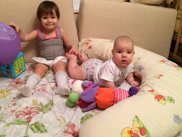 Спим по несколько раз за день, но по-разному: то по 15-30 мин 3-4 раза в день, то по 1-2.5 часа 2 раза в день. На ночь укладываемся в 9-10, встаем в 7.30-8. С Аишкой любит играть, прям хозочет в голос с ней) а так же за волосы ее любит потрепать, доводя таким образом до слез))но не специально)