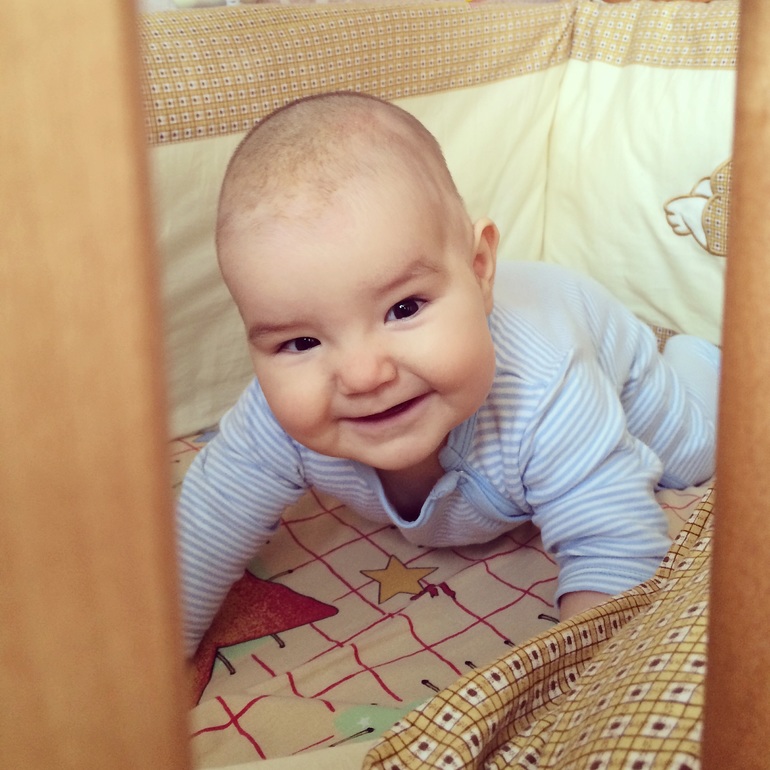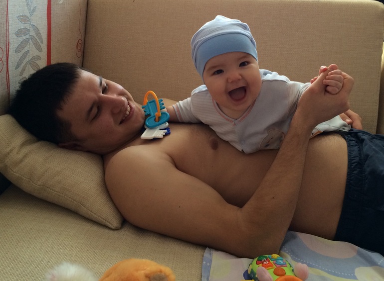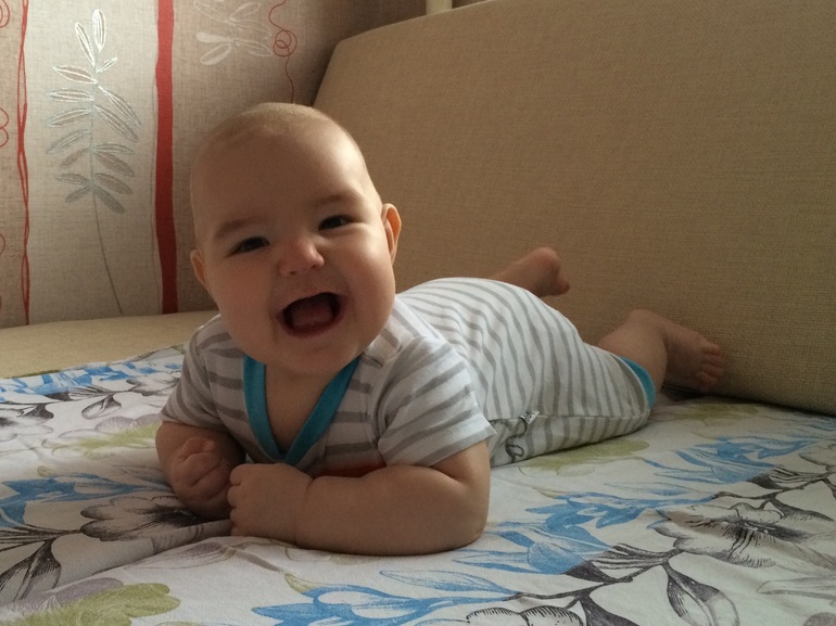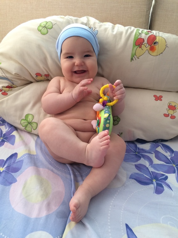 Вес 9.2, рост 68см. Попробовали цветную капусту, вроде понравилась) дня 3 ели по 2-3 ложечки, потом приболела старшая, на всякий прикорм убрала. Из умелок: переворачиваемся в обе стороны на животик и обратно, крутимся вокруг своей оси, своеобразно передвигаемся по всему дивану, приподнимаемся на четвереньки и немного раскачиваемся, игрушки хватаем и двумя руками, и по одной, дотягивается до мобильки, переключает мелодии; разговариваем: агу, ага, ау, ой, ама, эммэ, пап, апа, гххх, бу) иногда и среди ночи, когда ворочается, начинает бубнить)) смешной) все нам интересно, прям выпрыгивает из рук, все трогает, все хватает, ну и конечно же все в рот) руки постоянно во рту, слюни рекой, зубиков пока не видать) но думаю, к 6-6,5 мес покажутся нижние). Сидеть не умеем и не сажаю, и не буду, сам сядет, попытки делает, но спинка слабовата еще. Массаж начали второй курс, но пришлось прекратить пока, опять же из-за болезни Аишки. Думаю запишусь на след.неделю, продолжим. Если не получится, тогда на декабрь и снова полный курс. Ришатик по-прежнему любит купаться; любит гулять в коляске; в машине смотрит в окошко). В последнее время начал часто просыпаться по ночам, поест и спит себе дальше...пока со мной лежит...стоит переложить в кроватку, просыпается...и так по несколько раз пытаюсь переложить. Не высыпаюсь ни фига, но не ленюсь, а то Аишку так приучила с нами спать. Вчетвером сложно будет улечься))) а утром как ни в чем не бывало-улыбка до ушей) а маме хоть спички вставляй)) подмывать стало очень тяжко, вес то не маленький...а еще целуууется)