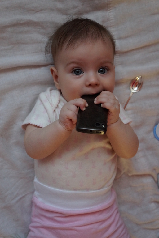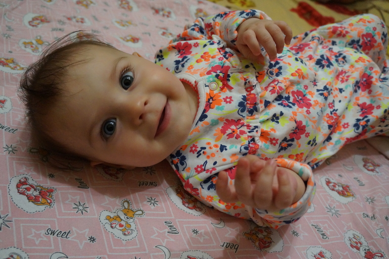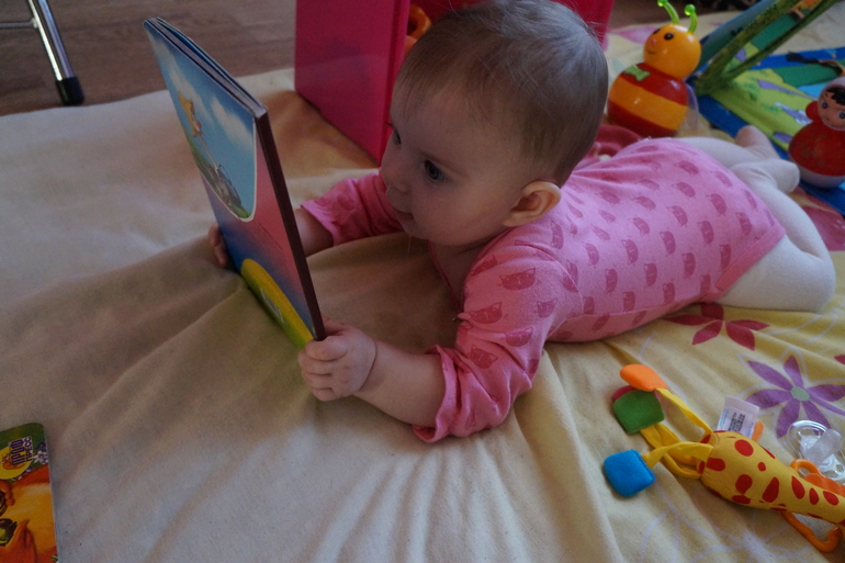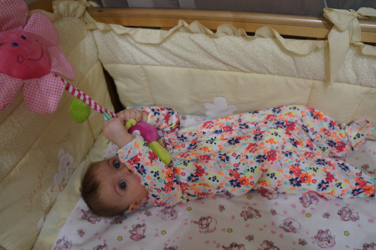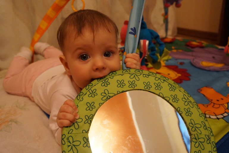 Из умелок пока ничего нового. Переворачиваемся активно во все стороны, ползаем на животе, как гусеничка. Ни сидеть, ни вставать на четвереньки Марьяша пока не собирается. Два зуба уже почти окончательно выросли. Вчера доча играючи укусила меня за сосок, боль дикая, я чуть не плакала, а она смеялась! Хулиганка маленькая))