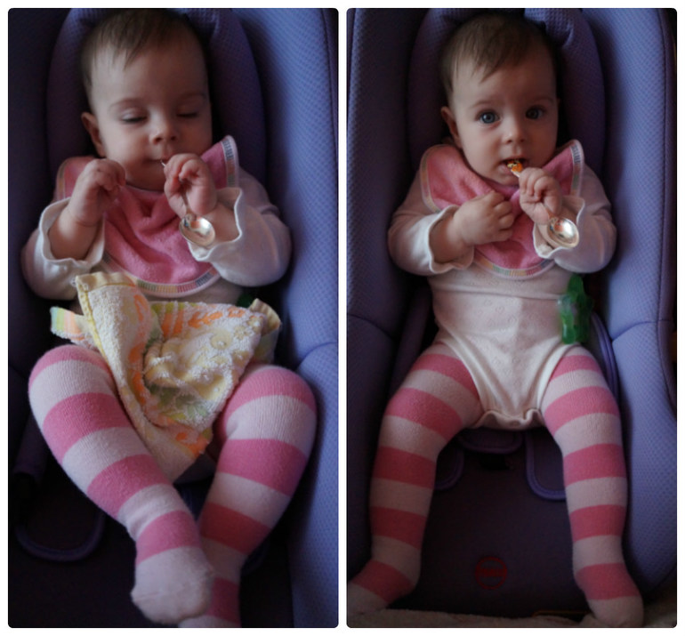 Уже неделю кушаем гречневую кашку, разбавленную маминым молочком. Для этого правда маме приходится вставать в 4 утра чтобы сцедиться, в другое время суток молоко ни в какую не цедится молокоотсосом не хочет. Ну и т.к. садиться пока рано, то прием пищи осуществляется в автокресле)) Стул и правда от кашки стал лучше. Но и пахнет теперь как у взрослой)) Теперь лишь бы прививка нам все не испортила.