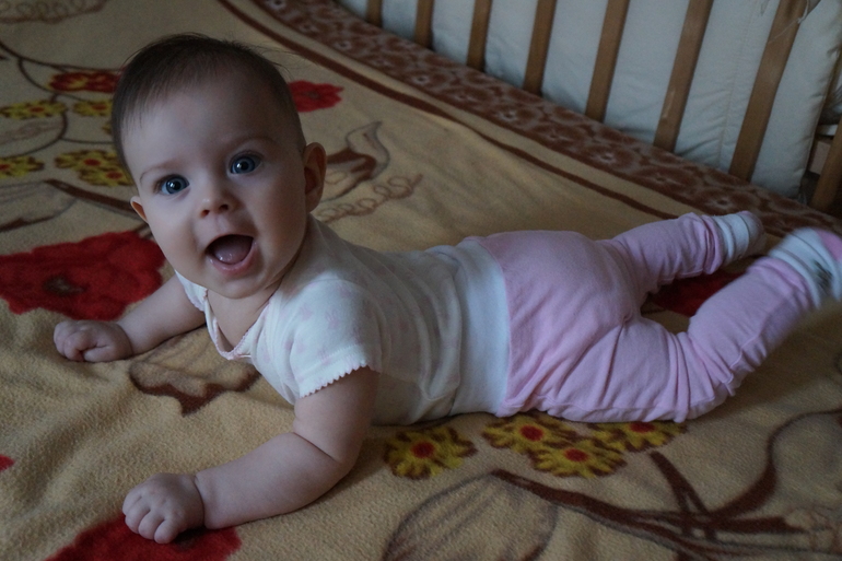Марьяша на фотографиях темненькой получается, но на самом деле больше на мой русый цвет волосы похожи, хотя лучше бы брюнетка в папу была)) Хотя тут заранее не узнаешь. У меня у подруги дочка до года белой-белой была, они еще удивлялись — в кого интересно? А потом быстро потемнела и стала похожа на папу с мамой))Пузыри мы тоже пускать любим)) И поворачиваться больше любим с правой руки, да и спит она у меня по-прежнему только на правом бочку. Грудь поднимает, а жопку нет, не видела даже чтобы она пыталась это сделать. Но я думаю, что может она вообще ползать нормально не будет (только на пузе). Я маленькая не ползала, сразу потом пошла.