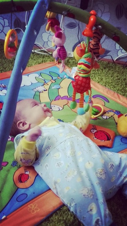 4. Стал лежать на развивающ. коврике и все смотреть, рассматривать и общаться с любимыми игрушками. Кстати самая любимая - это жирафик! Он его лучший друг, собеседник. Никто не может так развеселить Лёву как этот маленький жирафик с его лапками) (на фото он будет)