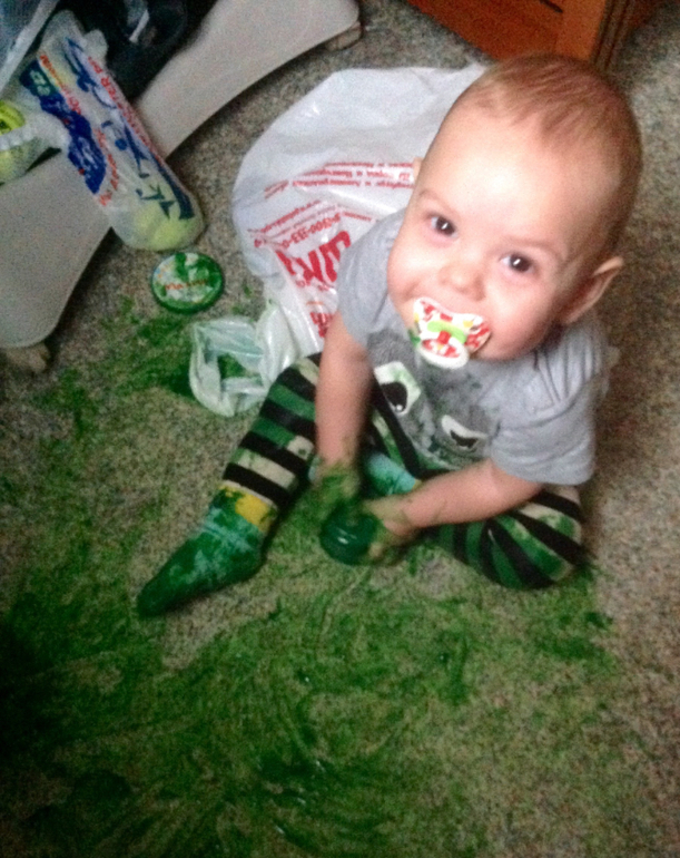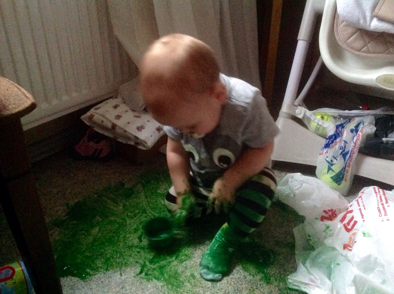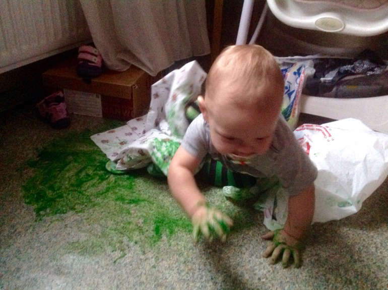 Так вот и я сегодня - отвернулась на минуточку, при чем вместе с ребенком на кухне находилась, только сидела в полоборота спиной к нему иногда поглядывая на него, сидел себе ребенок пакетиком шуршал в общем дал маме небольшой отдых от таскания его на ручках за 6 часов))), слышу что-то тихо и никто уже не шуршит))) , повернулась, смотрю - а он стащил со стола краску, вскрыл ее, ВСЮ вывернул на пол и увлеченно размазывает по полу:))