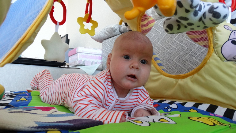 Из умений- голову держит отлично, на руках приподнимается ненадолго пока на животике лежит, периодически переворачивается с живота на бочок- за игрушкой, а еще (чаще во сне) поворачивается со спинки на бочок и обратно), в перевороте на живот замечена не была. Гукает-агукает с каждым днем активней.