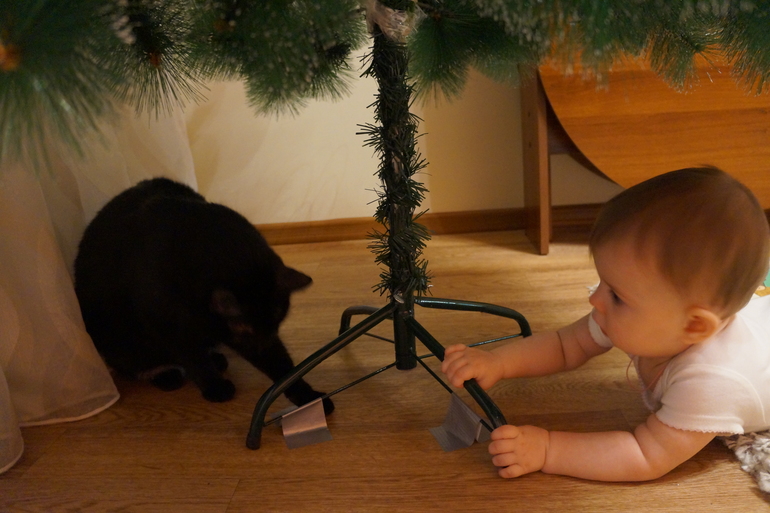 Мама поняла, что елочку необходимо укреплять. И кот, и дочка активно сопротивлялись: