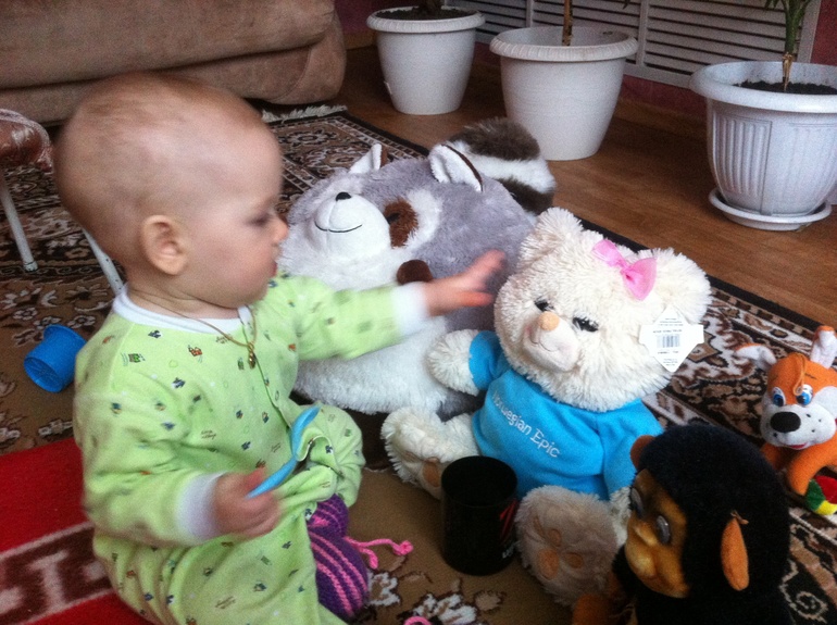 Здорово!У нас пока подобными играми не пахнет. Тим совсем не интересуется мягкими игрушками и не воспринимает их как "друзей", с которыми можно общаться и кормить. Хотя, надо сказать, я его этому не учу, мы больше играем кубиками, пирамидкой, машинками и всякими неигрушечными предметами.