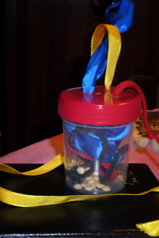 А еще мамка соорудила вот такую штуку. Но ему пока не удается схватить ленточку, чтобы за нее потянуть. Поэтому убрала до лучших времен. Может, подрастем, оценим.
