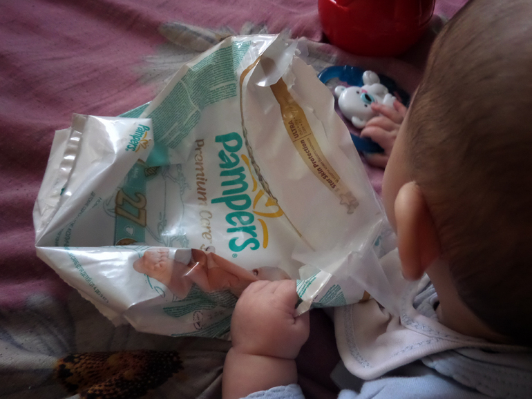 А я однажды переодевала и чистый памперс рядом оставила. Он его схватил и жамкает))) да, так, что его аж потрясывало))) хотела забрать - расплакался)) это самая любимая игрушка. Пакет тоже нравится.