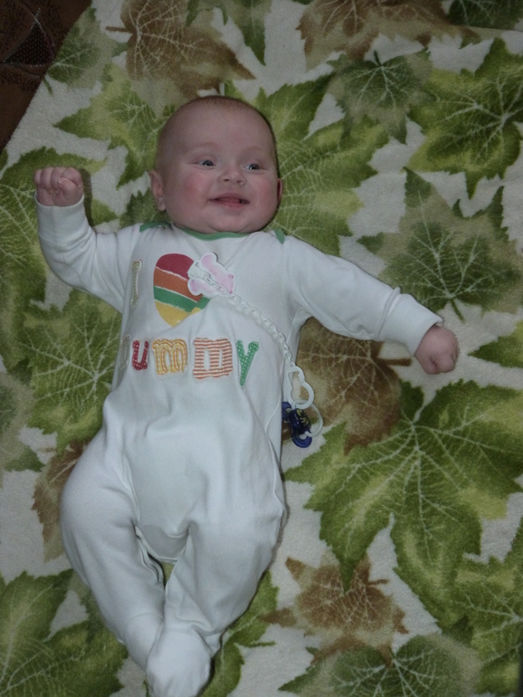 Гулять стали реже,потому что погода ужас то дождь то туман и ветер сильный что малыш задыхается и дышать не может,в таких случаях выходим и хоть чуть возле подъезда тусим))ну а когда дождь дома в окошко смотрим на улицу только))На животике лежать все так же не любит,минут 5-10 и всё,начинает плакать нервничать,иногда переворачивается на спинку)а вот обчеактиратно пока никак...(Полюбили мы погремушки,охотно берет их у меня из рук и конечно сразу в рот,как и всё что попадает в руки))Любит еще он пеленки трогать,или то на чем лежит сразу идёт в рот,получается так что закрывает себе лицо,потом психует)))выглядит смешно)Сон у нас ухудшился к сожалению...(раньше мог спать 8-9 часов,иногда чуть меньше,не просыпаясь,практически до утра получалось,а сейчас встает пару раз за ночь,может и не кушать,просто просыпается хнычет...может зубки,так как слюнеееей капец)))Любит еще мой масик разговаривать,особенно с дедом и папой,мужик блин)))когда приходят с работы радости нет предела)))