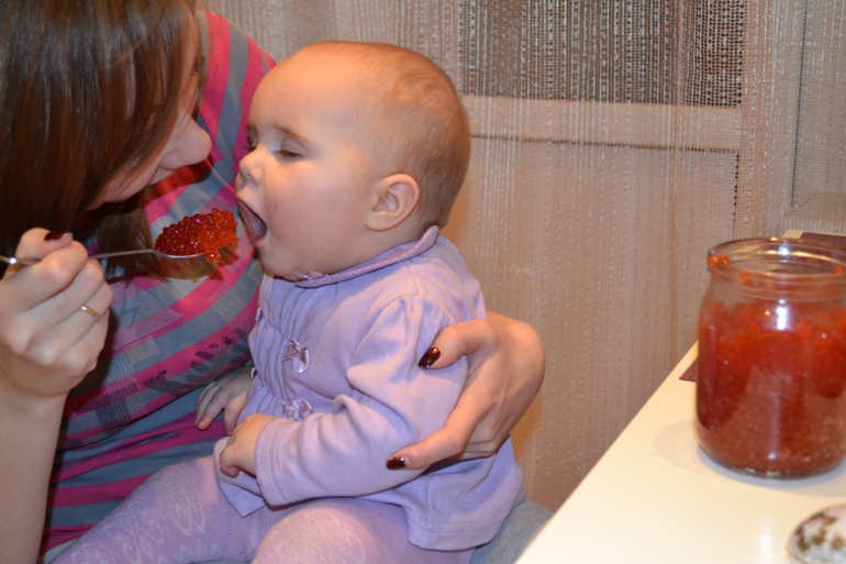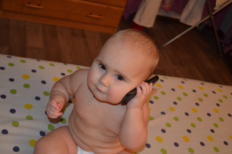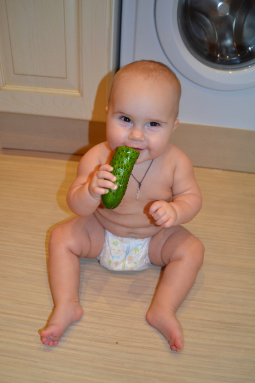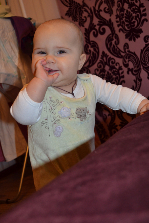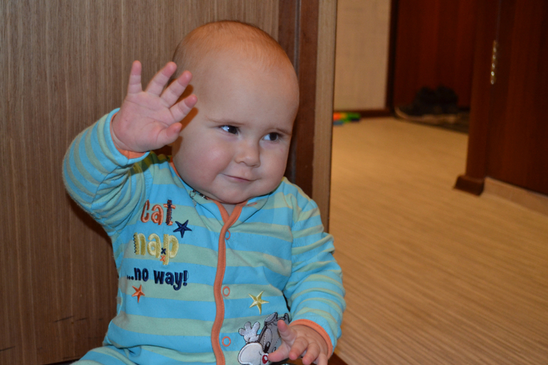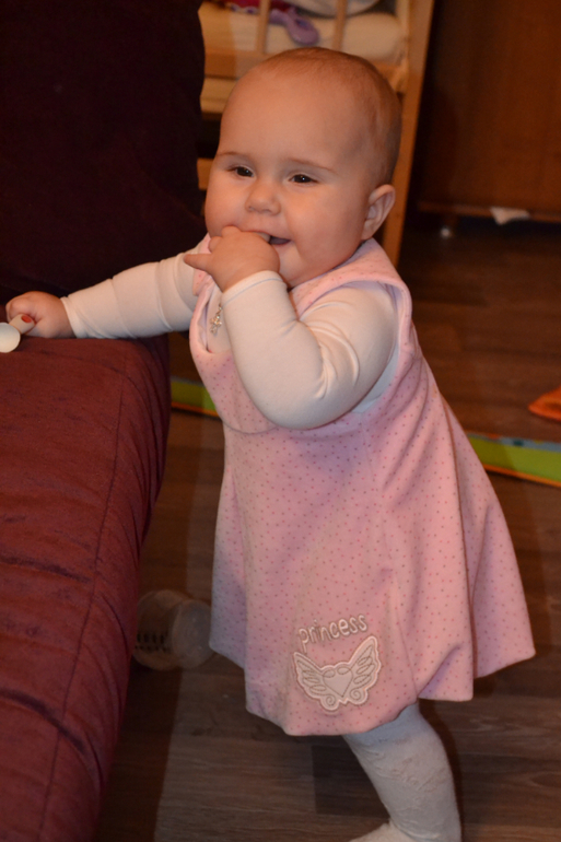 Она уже совершенно все понимает, отлично отличает интонацию, при повышении тона и строгом голосе быстро убегает/уползает, особенно, если знает, что делает что-то запрещенное (например, облизывает колеса коляски или папины ботинки). Знает слово «нельзя», но когда ей говорит папа, то притворяется, что не понимает его, потому что папа ее ругать не умеет)))) Обижается, когда на нее строго прикрикнешь, наругаешь - смотрит две секунды четко в глаза, куксится вся и плачет с горючими слезами, сразу с протянутыми руками идет ко мне (пожалеть). Стоит, держась одной рукой за опору (например, стул), медленно опускается на корточки, поднимает с пола что-то, поднимается сама вместе с добычей - и так может делать очень много раз, у меня ощущение, что она вообще не устает))) Очень стала круто передвигаться в вертикальном положении - вдоль дивана бегает, по кухонной мебели и за ручки ходит уже очень уверенно, но за одну ручку боится - пройдет недолго только если забудется. Также забудется и может простоять без опоры секунд 8 максимум, но это еще не очень осмысленно. Последние приколы месяца: делает ппр с язычком, смеется как будто кашляет кха-кха - не знаю, откуда это взялось, но муж говорит, что это я так делаю, когда с ней играю, часто протягивает руку ладонью вперед (типа «хватит!»), но мы не понимаем, что это у нее означает, часто поет (только гласные или вавава, включает пультом телик, прижимает тел к уху, как взрослые разговаривают (хотя мы ей никогда специально не показываем, а по тел в основном я при ней разговариваю на громкой связи, потому что она тоже любит общаться). Ах да, самое прикольное, это то, что после купания она с голой попой ползает по дивану, играя, что она нас с папой боится, как будто убегает от нас, это очень забавно выглядит, она как бы встает на колени (без рук), ждет, когда мы ее будем пугать, чтобы с победным писком резко упасть на руки и быстро уползти и лечь (как бы спряталась). Мама еще не говорит, но когда плачет и хочет ко мне, то в плаче получается типа «мамамама…» - не знаю, осознанно или нет, сегодня первый раз сказала "мама", посмотрев на меня - я пыталась научить ее говорить "дай", а она посмотрела и говорит "мама!")))) Целуется, когда попросишь, сама почти никогда не полезет)