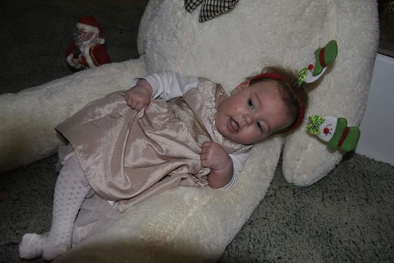 Ника активная девочка,ловко переворачивается на животик через оба бочка,обратно пока никак.Научилась ползать по пластунски.Это так смешно.Задирает попу кверху и отталкивается при этом немного помогая себе ручками.На вытянутые ручки пока не встает.