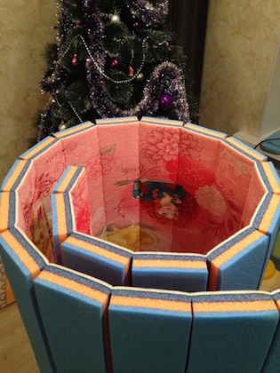 С двух сторон диван, с третьей гипсокартонная стена, с четвертой — обернутые в пледы листы пеноплекса (остался с ремонта квартиры) — он прочный, но в то же время легкий. Удариться об него не страшно. Только пока не придумали чем же его подпирать (пару канистр воды она спокойно отодвигает ;))