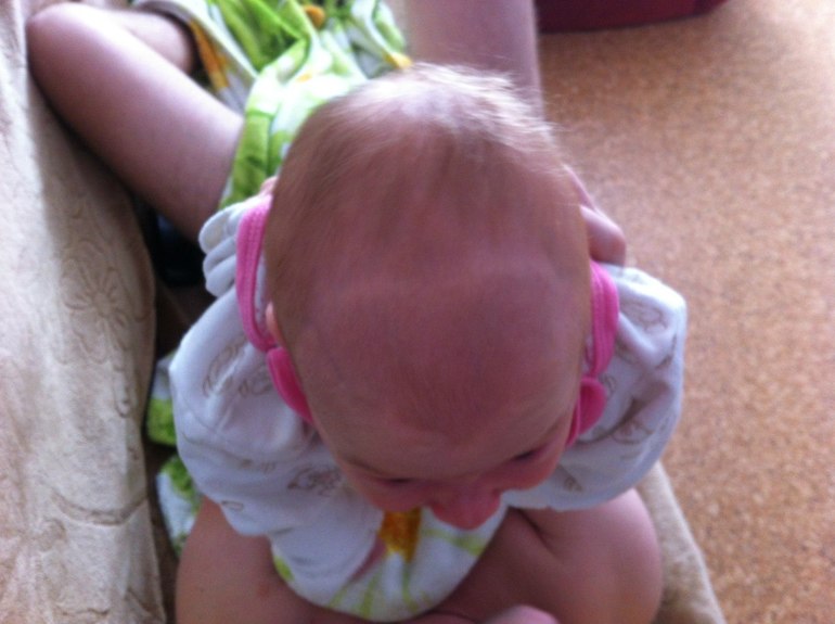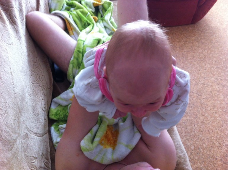 -Лежа на животике, пытается поднять головку, и держать её, когда опускает головку, начинает кряхтеть, плакать, что не получается дольше, носик постоянно от этого занятия красный, а ложишь на спину обратно, не нравится, плакать начинает, показывает уже характер:)