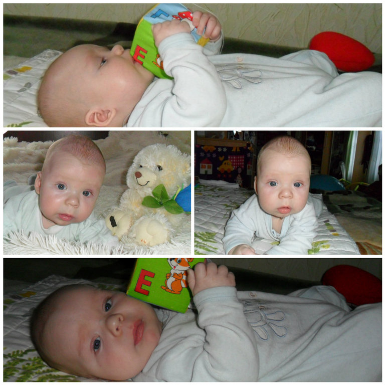 ХвастаемсяНашему сыночке Ванечке завтра ,14 февраля, исполниться 4 месяца.Мы уже такие большие и так много уже умеем делать..Даже не вериться что он был таким крохой и ничего еще не понимал…и сложно представить что он скоро будет ползать, ходить, говорить ...А сейчас с каждым днем он становиться более смышленным и взгляд уже такой осознанный. Напишу чему мы научились за это время. Нам очень нравиться играть с разными игрушками..Движение еще не четкие но видно как Ванечке уже быстрей хочется научиться играть. Раньше мог лежать в кроватке и слушать мобиль минут по 20-30..сейчас же внимания к себе требует больше и одному лежать не так интересно.Еще нам очень интересно смотреть на магниты на холодильнике и тянуть к ним ручки.. При этом все тащим в рот….И кулачки в том числе..самые вкусные.!!!))Очень хорошо держим головку и лежа на животике ручки складывает и на все смотрит..и делает это уже без особых усилий. Стараеться переворачиваться…пока только получается с животика на бочок..Очень любим поговорить. Агукает активно. Может лежать, смотреть на потолок и с кем то разговаривать.Так интересно наблюдать.И когда к кроватке подходишь при виде меня или папы улыбается и разговаривает.))Еще нравиться когда я его хвалю..как только начинаю говорить какой он хороший и любимый расплывается в сладкой улыбке.