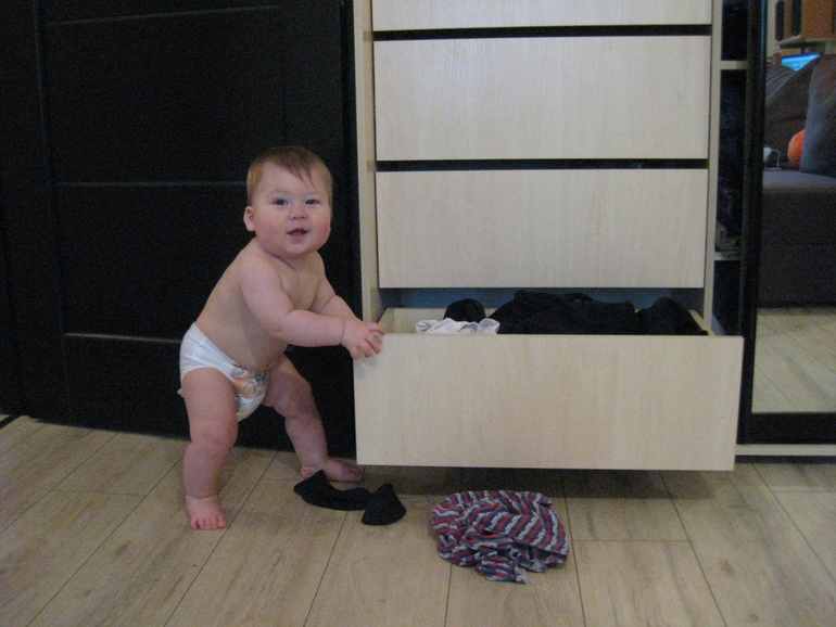 выдвигает ящички в шкафу, вытаскивает папины трусы/носки и раскидывает по полу. в кухне раскидывает пакеты, все что найдется в ящике. стремится залезть под мойку. переворачивал пару раз мусорное ведро.