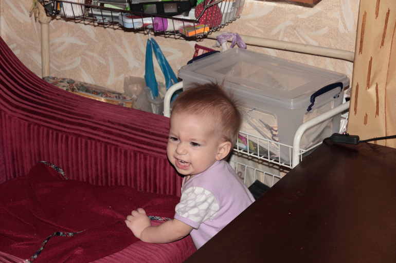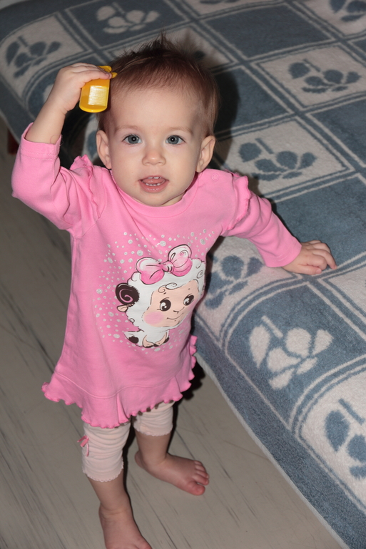 Собирает пирамидку (корявенько, но собирает), кидает мяч, дает когда просишь что-либо , вообще многое понимает, но вот говорить пока отказывается. Показывает на картинках бананы, зверей и детей с переменнным успехом. Полюбила листать книги, но погрызть их тоже не забывает. Показывает как надо спать в кроватке, но ессно спит с нами. Любит складывать-доставать из разных коробочек. Подаренные на год подарки пока стоят, они все с какой-то дикой озвучкой, ребенок боится. Даже резиновый конь ржет! Зачем?