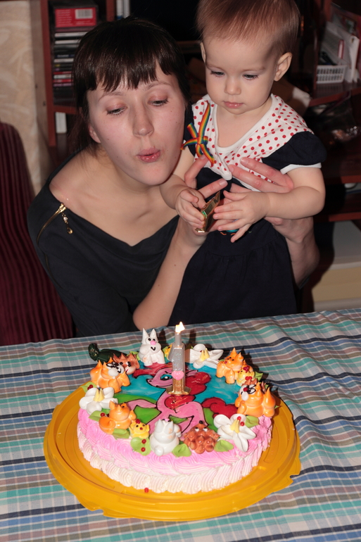 День рождение отметили тихо-скромно, пришли бабушки-дедушки, пообщались, именинница вела себя хорошо))) Тортик на 2 год уже буду делать домашний, тогда и дам попробовать. Немного фоток с Днюхи)))