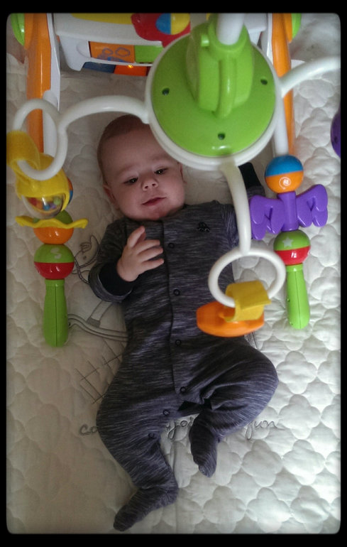 Симпатяга какой растет!А я большинство погремушек привязала: некоторые к стульям, развивающему коврику, а то тоже бьется в истерике, если выпала из рук. =)