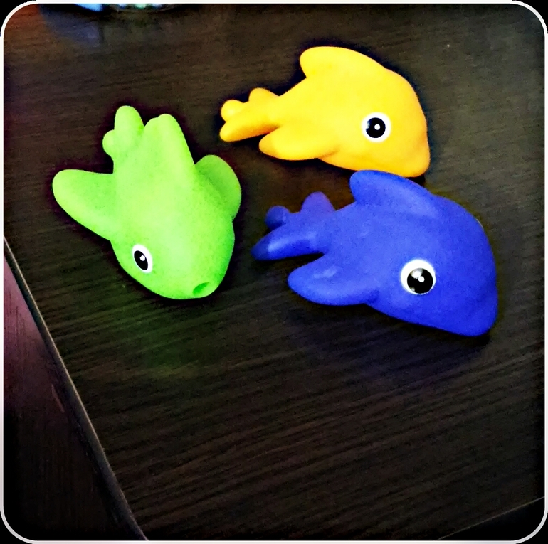 Еще нравятся пискливые резиновые рыбки, будем чуть постарше брать их в ванну купаться