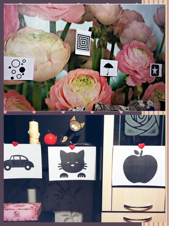 Еще развесила по комнате черно белые картинки. Очень любит их разглядывать, когда гуляем по комнате, может наблюдать очень долго.