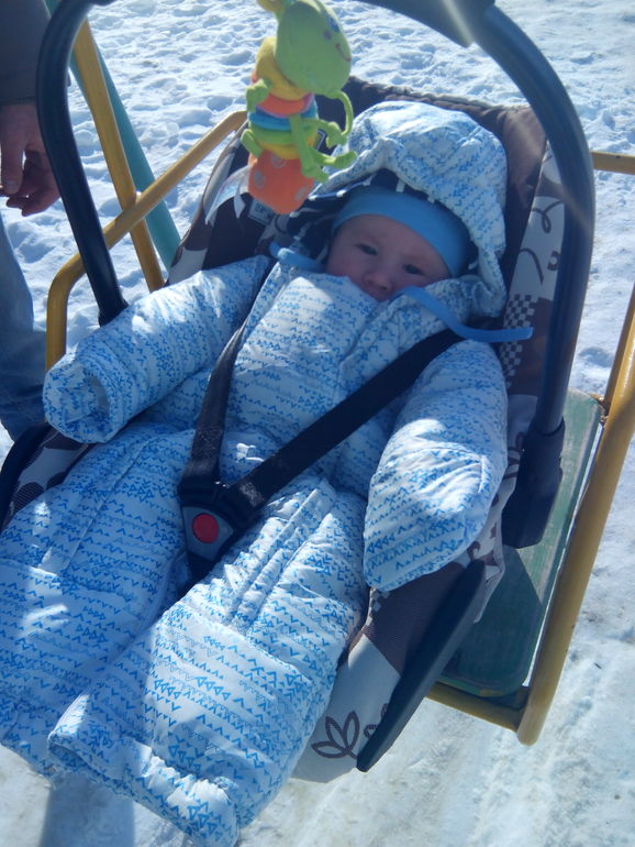 И еще мы купили со скидкой новый комбинезон, в котором теперь можно пристегнуть Платошу в автолюльке!