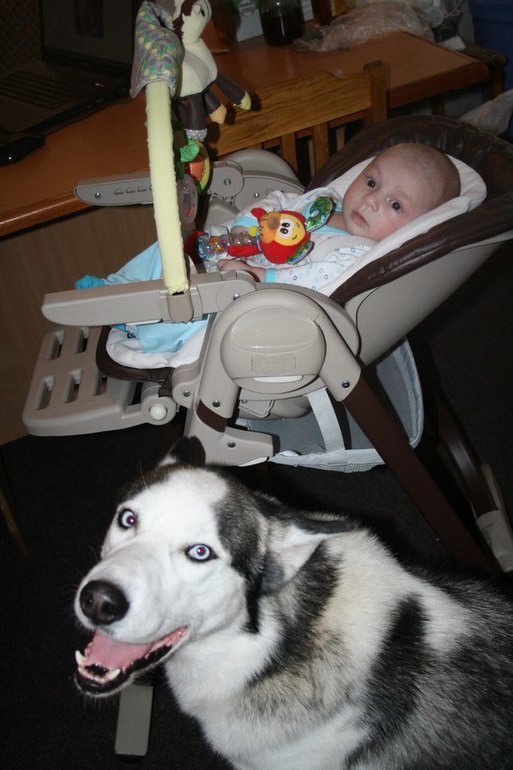 Макс заметил собаку Кая, а Кай заметил ребенка Макса. Теперь они кайфуют друг от друга. Макс смотрит на Кая трепетным взглядом и успокаивается от его гавкота. А Кай нюхает малыша и облизывает ему ручки, потому ручки у нас сейчас моются постоянно. Надо бы завести какое-то специальное жидкое мыло для детлашни. )
