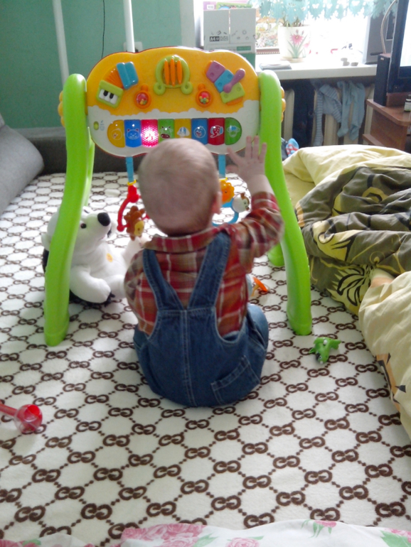 Что имеем: сидим, ползаем, пытается встать, исследуем квартиру полностью.... ложимся именно где холодно - на плитке в коридоре, в ванной - там тоже плитка) Вчера сам залез в свою старую ванночку, она стоит под его кроватью.