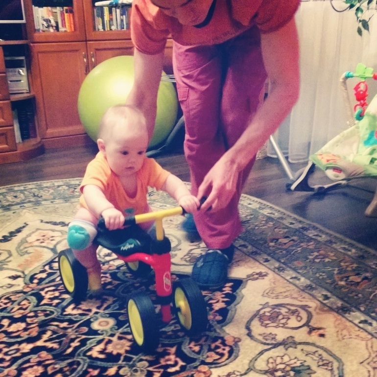 Купили ей первый велосипед, ноги конечно пока до пола не достают, так что катаем мы с мужем.