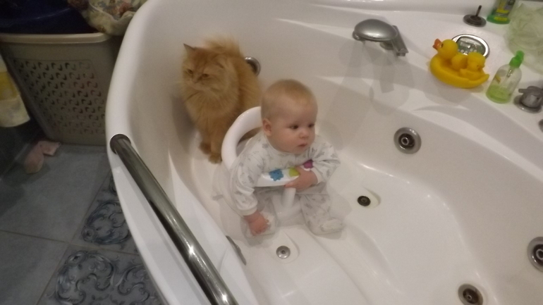 Купаемся с рождения в большой ванной., раньше в круге, сейчас в сидении, правда в последние дни стал наклоняться и обгрызать с сиденья игрушки. попутно хлебая воду, теперь ломаю голову, как купать. Гуляем на улице во время сна, вернее как гуляем, коляску во двор выкатили, он уснул и можно домой идти, коляска под окном стоит, в своем доме с этим проще.