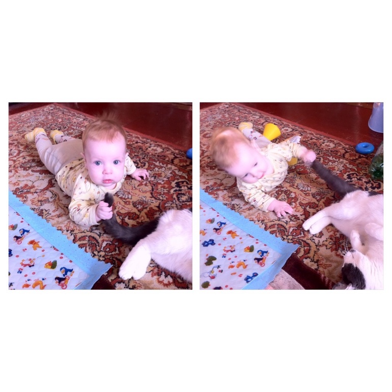 Вот и у нас кот мужественно терпит (ему 3года).он у нас послушный.если что то не понравится уйдет, не цапнит. За все время не разу в кроватку к Диме не залез, хоть и любопытный
