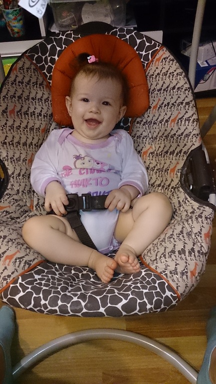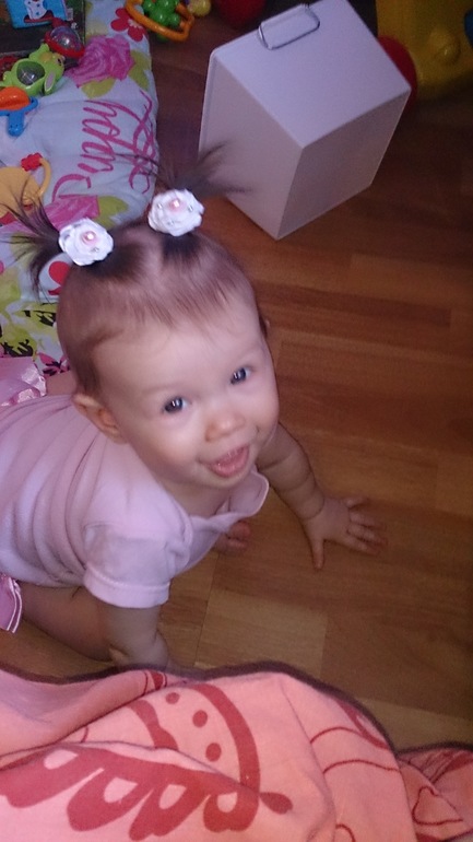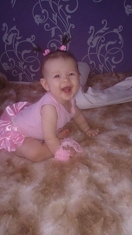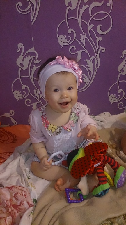 А активничаем мы конкретно, что мы имеем к семи месяцам. Садимся и сидим сами. Встаем у опоры, пробует топать за ручки. Ползает настолько шустро что не догонишь, особенно если в зоне её видимости появился наш песик. Он её боится, а она от него аж ну пищит. Активно ведем жизнь на полу поэтому мама ежедневно делает 100500наклонов уборки игрушек. Бьемся, падаем у мамы пол головы седых волос.