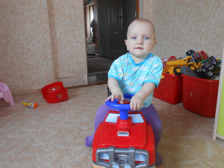 показывает носик у игрушки, больше ни чего не показывает. из игрушек только машину и юлу показывает. пирамидку так и не умеем собирать, раньше только грыз, теперь я колечки одеваю, а он снимает, одевать не хочет. В игрушки не особо любит играть, больше в кастрюли, ложки, половники, дуршлаг все что есть на кухне может занять его минут на 20-30. Ходунки совсем убрали больше они его не интересуют.