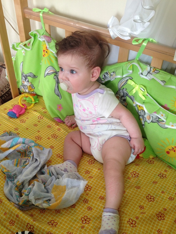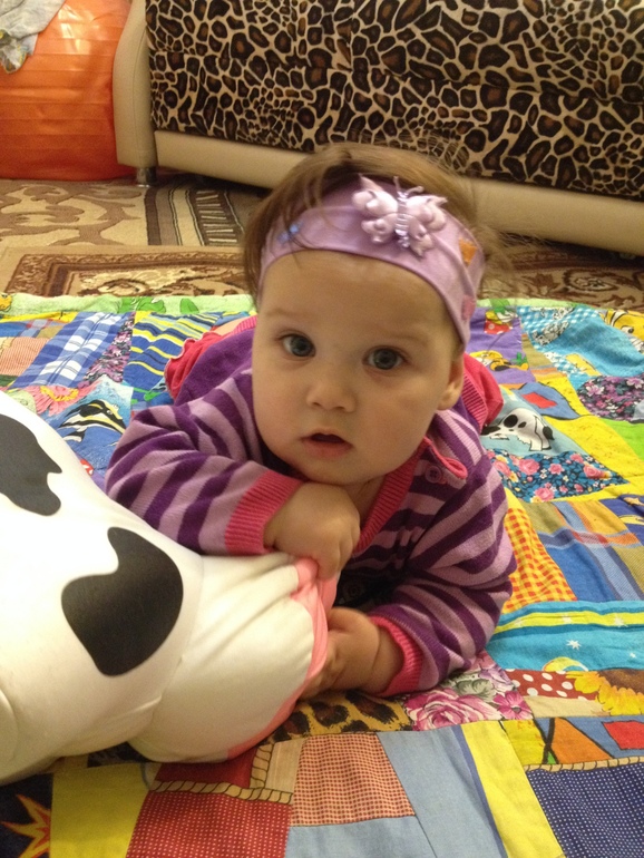 Пытается садиться, лежит на одном боку как русалочка) а сегодня села у опоры в кроватке. Цокает языком в ответ на цоканье, минут 20 можем цокать друг другу. Со сном беда, была противницей совместного сна и пол года боролась сама с собой, чтобы не положить ее с собой, в итоге не выдержала и сдалась). Засыпает на ночь в кроватке, ночь спит очень плохо поэтому беру к себе, поближе к тите. Спит плохо, предполагаю, что скоро зубки полезут, правда десна мне кажется не изменились, а вот поведение говорит о том, что скоро будут, но может я и ошибаюсь, посмотрим. Гуляем 2 раза в день опять же, чтобы спала. Так и здесь она уже стала сопротивляться, может начать хныкать или просто не спит. Катать в коляске туда-сюда не канает, надо чтобы мама именно шла). Встаем рано около 6,30, но может и раньше и чуть позже, максимум в 7. При этом раньше она засыпала после купания, как покормлю, теперь нет, стала позже засыпать бывает и в 23 и 23,30. Временами я мама зомби, особенно последние 3 дня. Ей принципиально важно, чтобы мама утром не спала, если она встала, играть одна не будет, смотрим на меня и орет, как только я глаза открою, рот до ушей и все хорошо, поваляться утром с ней не выходит). Ну вот вроде бы и все и фоточки))