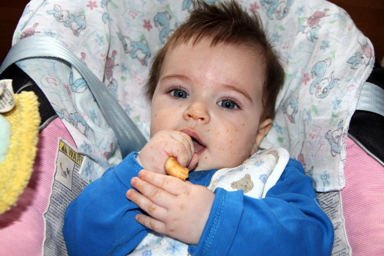 Зубов пока нет, но сушки уже зауважал. Обсасывает пока мама не отберет уже развалившуюся.