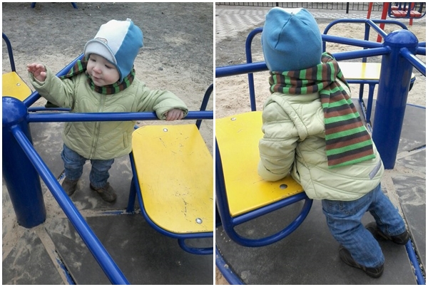 Возможность стоять самостоятельно парень воспринял, я бы сказала, с восторгом, но как и подобает мужчине, восторг был показан маме сдержанно, без улыбок и торжественных возгласов. Упорное топание по направлению к детским качелям показало маме, что кроссовки с боем она одевала не зря ))