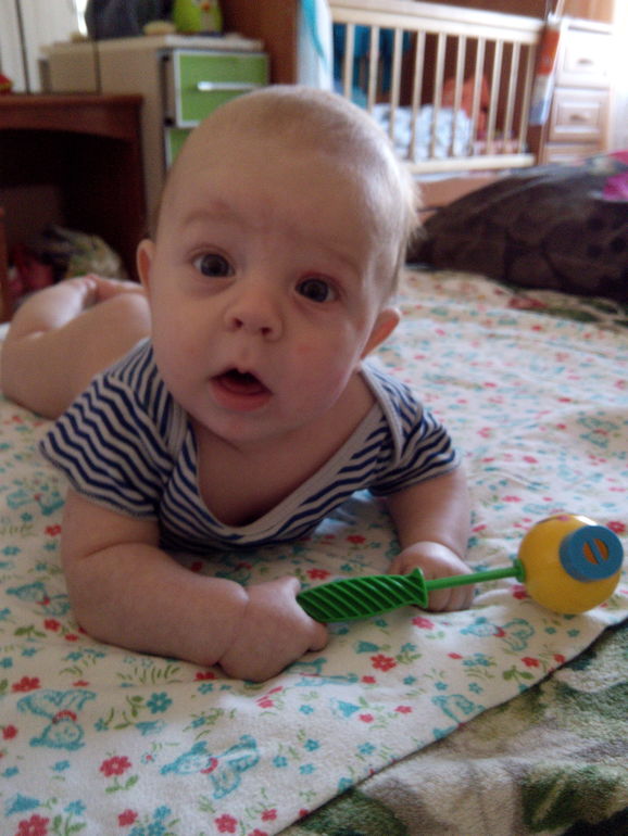 а также лежа на животе высоко поднимает попку,опираясь на ножки. Таким макаром уже пару раз перевернулся с живота на спину:) сосет,облизывает и ест все,что ему попадается:кулаки,пеленку,плед,игрушки,мамину руку и прочее:) тянет руки к игрушкам,потом пробует на зуб:)